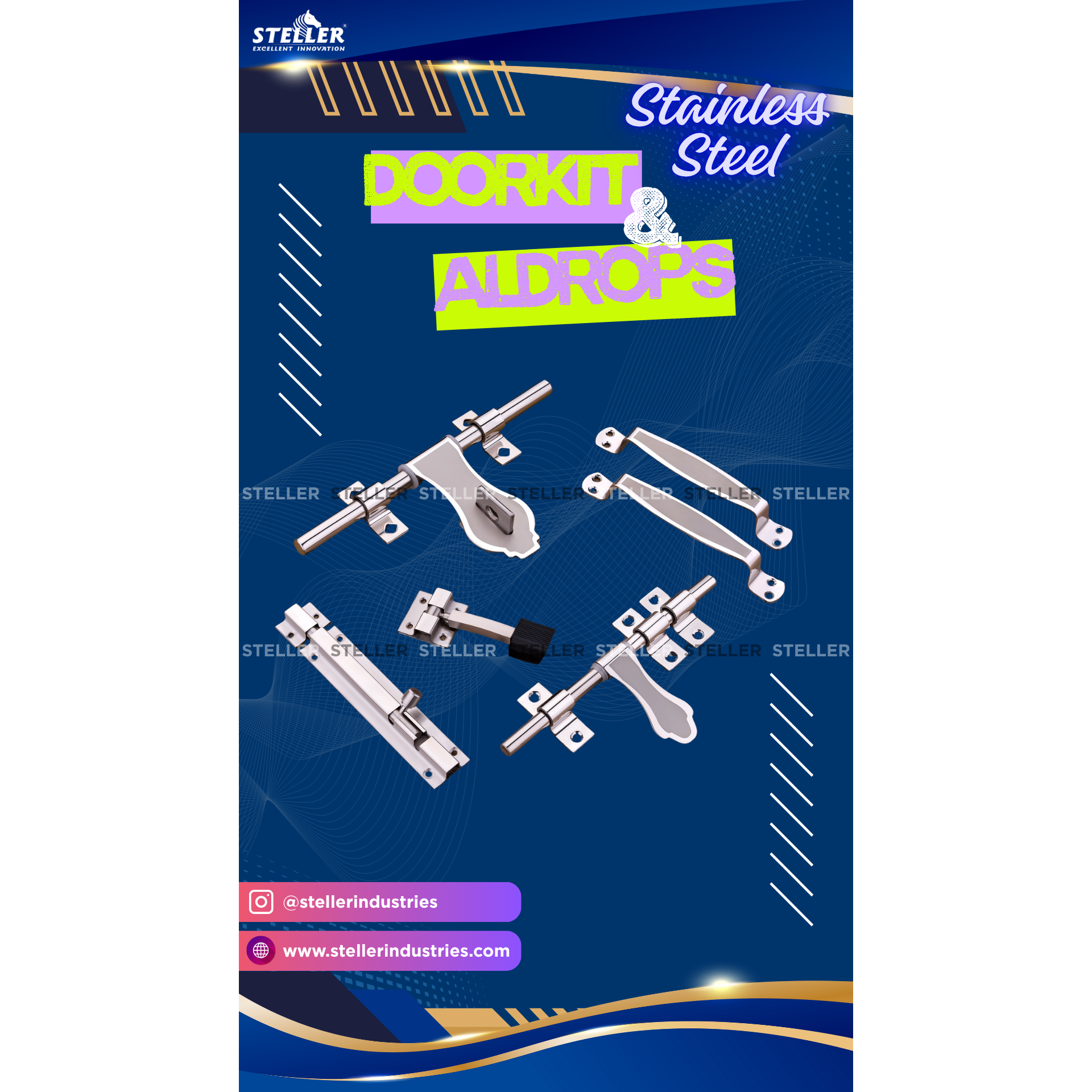 Upgrade your home or office with our Premium Stainless Steel Door Kit, crafted with precision in Rajkot, Gujarat – Made in India. This full door kit is made from high-quality SS 202 grade stainless steel, ensuring durability, strength, and rust resistance for long-term use. Each kit includes: 1 Aldrop with laser marking for a premium finish 2 Stylish door handles with ergonomic grip 1 Durable door stopper 1 Secure tower bolt 1 Reliable door latch Whether you're renovating or building new, this set offers sleek modern design, superior cutting, and long-lasting performance – the perfect combination of style and security. ✅ Key Features: Made from SS 202 Grade Stainless Steel Precision cutting with premium polish finish Corrosion-resistant and weatherproof 100% Made in India – Rajkot, Gujarat Ideal for both residential & commercial doors Premium stainless steel door kit SS 202 door accessories Complete door hardware set Stainless steel aldrop with laser mark Door handle and latch kit Made in India door fittings Modern door kit Rajkot Stainless steel hardware manufacturer #StainlessSteelDoorKit #SS202Grade #MadeInIndia #RajkotMade #StellerIndustries #ModernDoorHardware #DoorAccessories #DoorKitCompleteSet #LaserMarkedAldrop #StainlessSteelHandles #HomeHardware #InteriorHardware #SSDoorFittings #QualityDoorFittings #InnovationInHardware #DoorSolutions #DoorStyleUpgrade